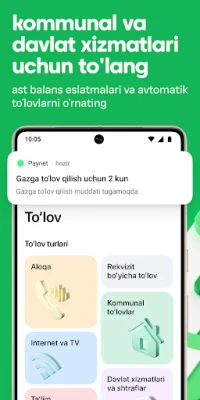 Paynet ilovasida siz: — Kartadan kartaga pul o‘tkazishingiz (Uzcard va HUMO qo‘llab-quvvatlanadi) — 1000 dan ortiq servislar uchun to‘lov o‘tkazishingiz — Bank kartalaringizdagi qoldiqlarni ko‘rishingiz — To‘lov tarixingiz orqali xarajatlaringizni kuzatib borishingiz mumkin